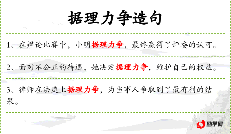 - 据理力争:成语,表示根据道理进行辩论或争取。
