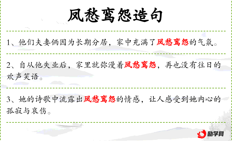 - 凤愁鸾怨:这个成语源自**传统文化,凤和鸾都是神话中的鸟,象征着夫妻。这个成语用来形容夫妻分离后的悲伤和怨恨。