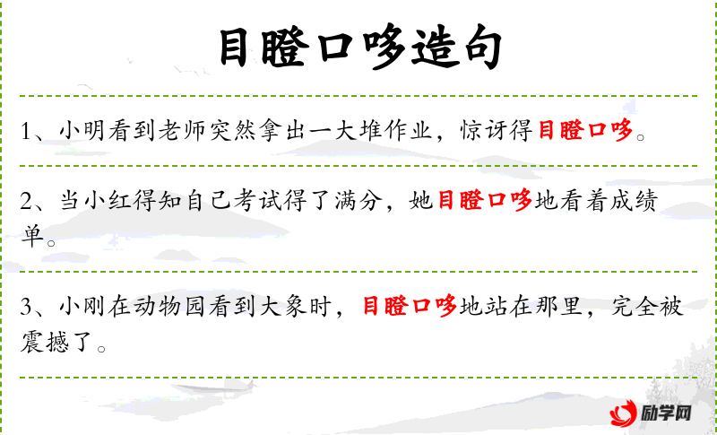 4. 【目瞪口哆】 - 瞪:眼睛发愣;哆:张口的样子。瞪着眼睛说不出话来。形容吃惊的样子。