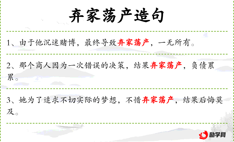 - 宾语:无明显宾语,但“弃家荡产”和“负债累累”可以视为结果状语。