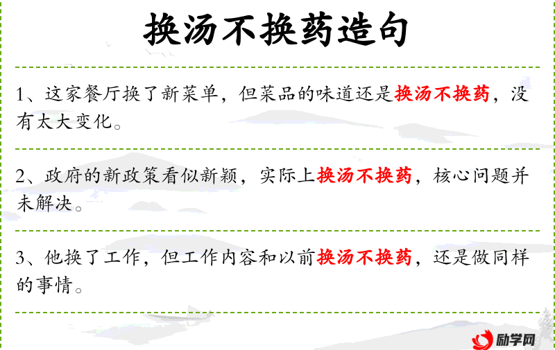 成语“换汤不换药”:源自中医术语,原指药物的汤剂只是换了汤水,但药物成分没有变化。比喻只是形式上的改变,实质内容没有变化。