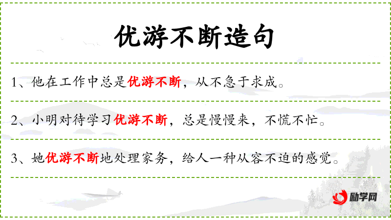 - 反义词:优游不断地 → 紧张地、急促地;从容不迫 → 慌张、匆忙。