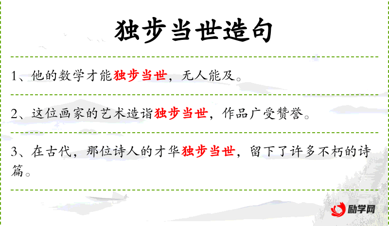 1. 【独步当世】 - 形容非常突出,一个时期内没有人能比得上。同“独步当时”。