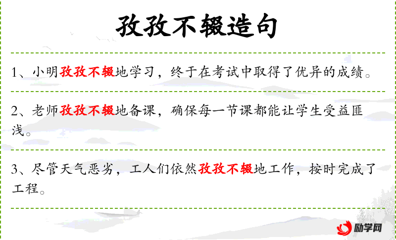 - 孜孜不倦:形容词短语,表示勤奋不懈。
