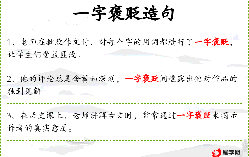 1. 【一字褒贬】 - 褒:赞扬,夸奖;贬:给予不好的评价。一个字的褒扬或贬斥。泛指记事论人,用字措辞严谨有分寸。