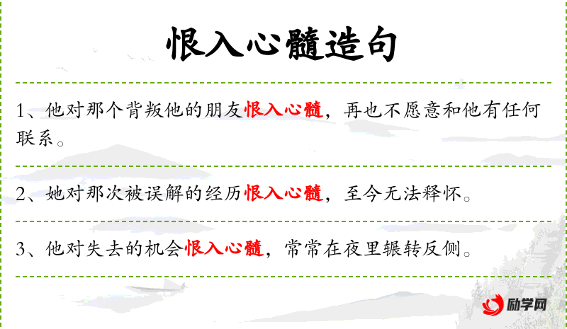 - 机会:名词,表示可能性和可能性的*。 . 恨入心髓:成语,表示极度憎恨。
