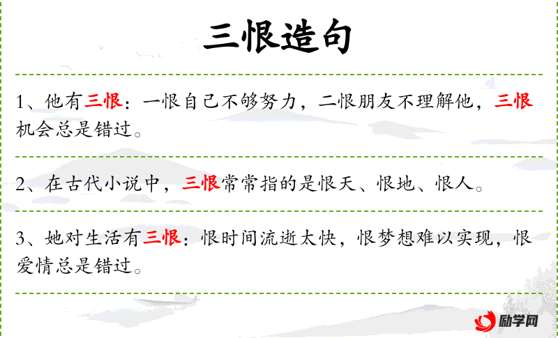 1. 【三恨】 - 三件憾事。唐薛元超以不得进士擢第,不得娶五姓女,不得修国史为三恨。见唐刘餸《隋唐嘉话》卷上; 三件憾事。唐时吐蕃乞立赞以不知天子丧,不及吊;山陵崩,不及赙;不知德宗即位,而发兵攻灵州,入扶﹑文,侵灌口为三恨。见《新唐书.吐蕃传下》。