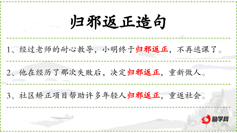 - 使用“归邪返正”这样的成语增加了句子的文化内涵和表达的深度。