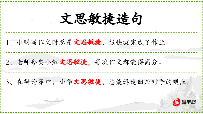 - 文思敏捷:形容词短语,指思维迅速、反应快。