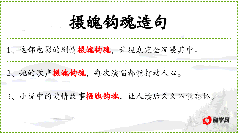 - 摄魄钩魂:形容非常吸引人,让人无法自拔。