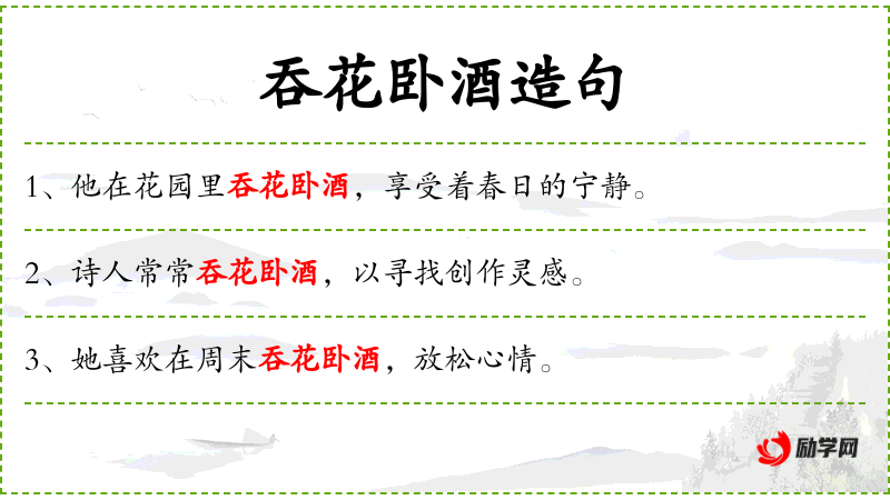 1. 【吞花卧酒】 指赏花饮酒,游春行乐。