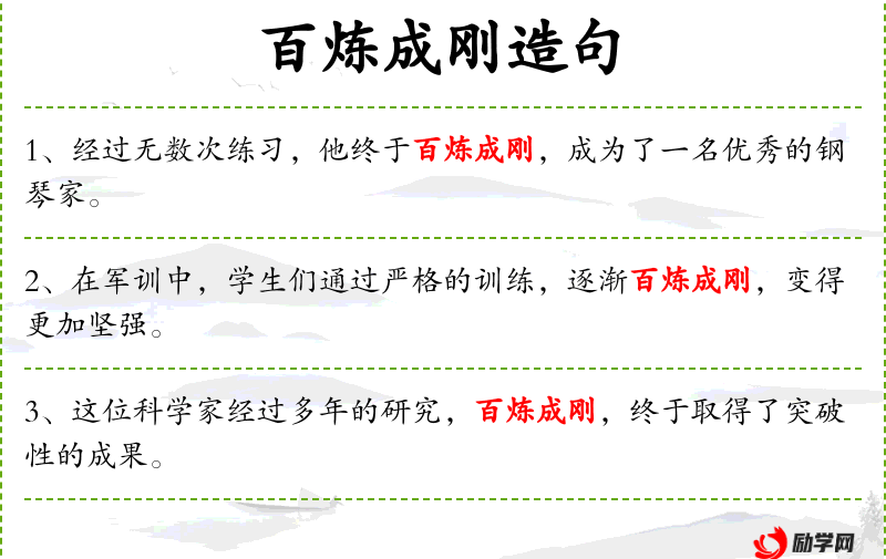 1. 【百炼成刚】 - 刚通钢。铁经过反复锤炼便成为坚韧的钢。比喻人经过多次磨炼而成为有用之才。
