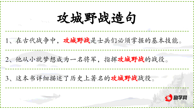 - 攻城野战:指在战争中攻打城池和在野外进行的战斗。