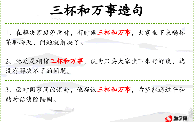 “三杯和万事”可能是一个成语或典故,暗示通过三次饮酒或三次协商来解决问题,强调和平与和谐的重要性。这种做法可能在**文化中较为常见,体现了对和谐社区的追求。