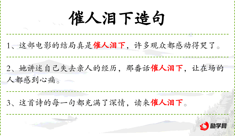 - 催人泪下:谓语,形容讲话非常感人,让人感动到流泪。