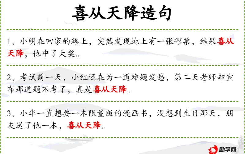 - 文化背景:在**文化中,“喜从天降”常用来形容意外的好运或好事。