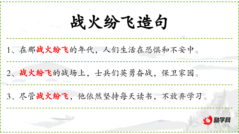 - 战火纷飞:形容战争激烈,战火四处飞溅。