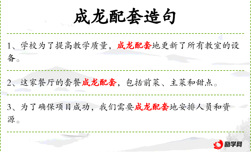 4. 【成龙配套】 将零部件搭配起来,成为一套完整的整体。