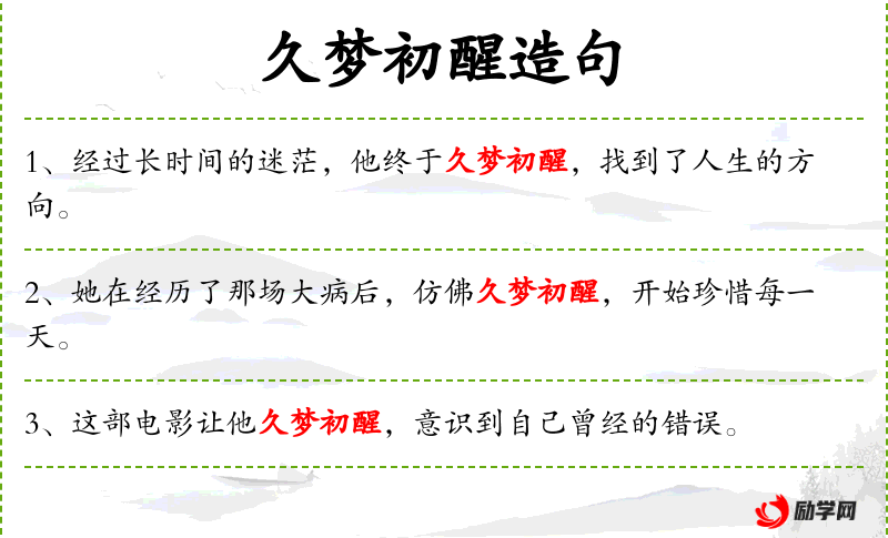 - “久梦初醒”这个成语在**文化中常用来形容人在经历长时间迷茫后突然醒悟。
