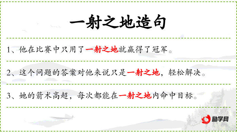 - 文化背景:在**文化中,“一射之地”常用来形容距离短或时间短。