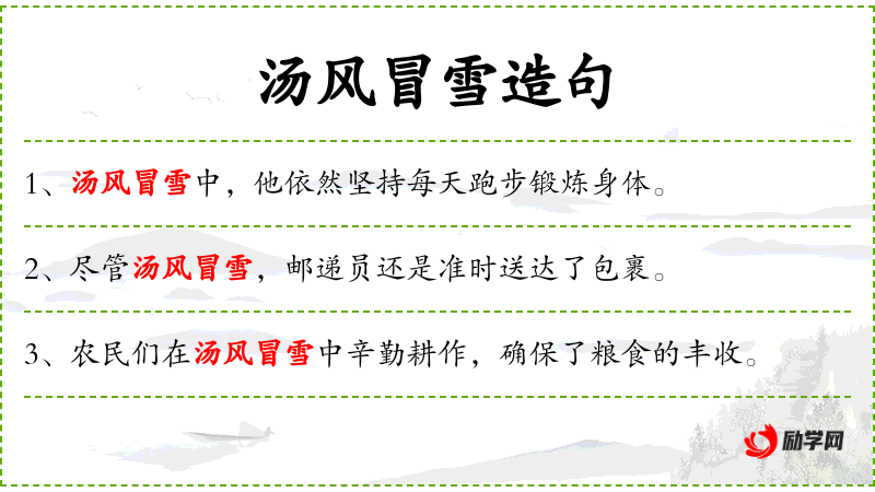 4. 【汤风冒雪】 汤:顶、当。顶着风,冒着雪。形容冬天旅途的艰辛。