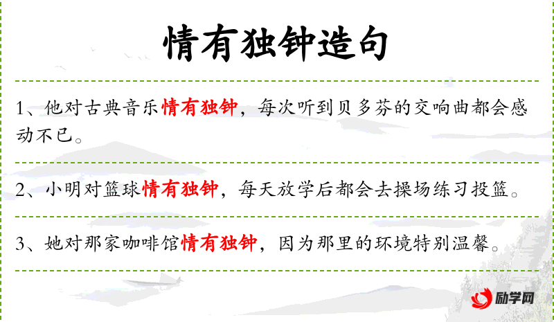 - 情有独钟:成语,表示对某事物有特别的喜爱。
