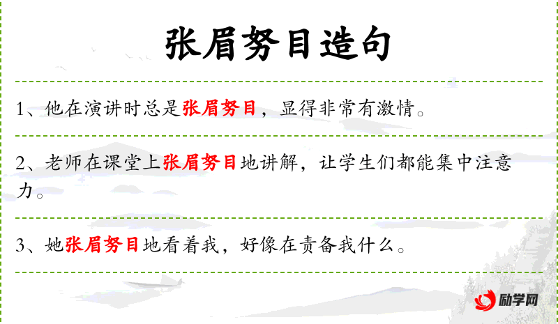 - 张眉努目:形容人非常努力或紧张的样子。