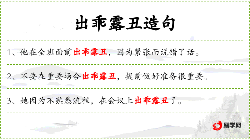 - 宾语:无明确宾语,但“出乖露丑”是一个动词短语,表示行为的结果。