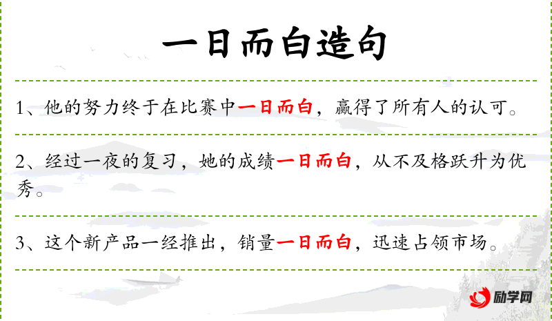 1. 【一日而白】 - 形容一下子名声大震。