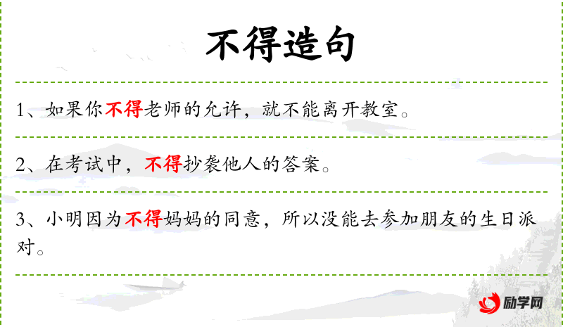 1. 【不得】 - 助动词。用在别的动词前,表示不许可:~大声喧哗丨~无理取闹。