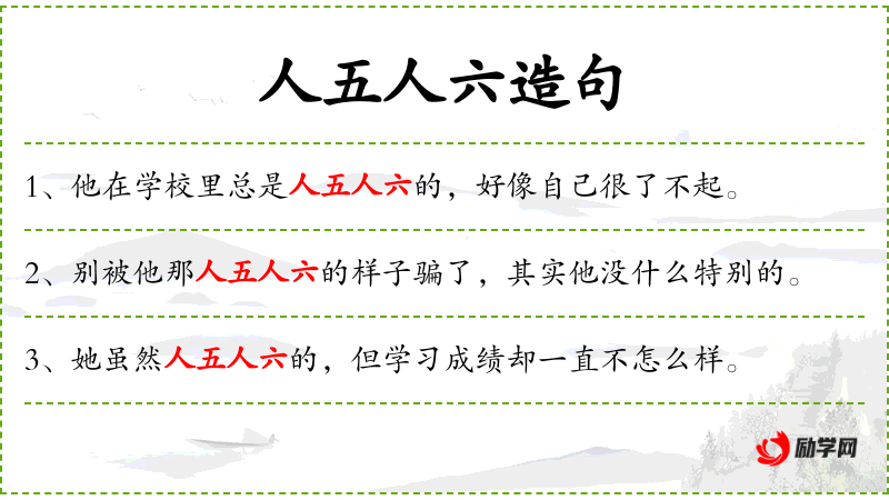 - 人五人六:成语,形容人装模作样,表面功夫做得很好。