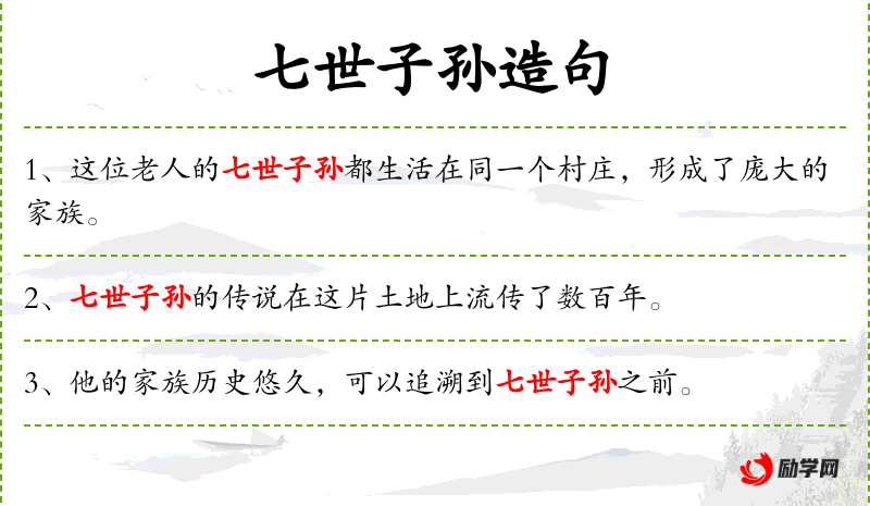 1. 【七世子孙】 - 指孙﹑曾孙﹑玄孙﹑来孙﹑晜孙﹑仍孙﹑云孙。《尔雅.释亲》"子之子为孙,孙之子为曾孙,曾孙之子为玄孙,玄孙之子为来孙,来孙之子为晜孙,晜孙之子为仍孙,仍孙之子为云孙。"