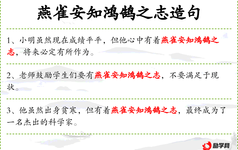 2. 【燕雀安知鸿鹄之志】 比喻平凡的人哪里知道英雄人物的志向。