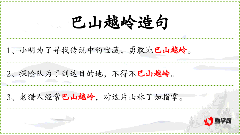 - 巴山越岭:形容长途跋涉,翻山越岭。