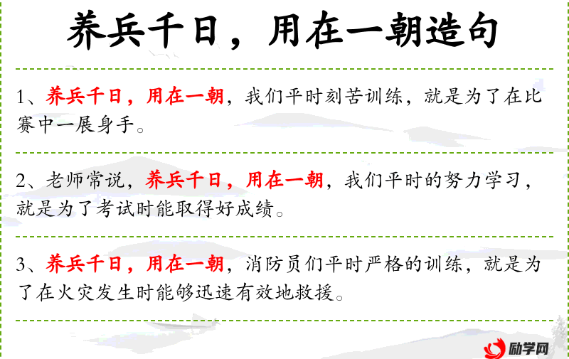 - 养兵千日,用在一朝:这是一个成语,意思是长期准备,只为一时的需要。