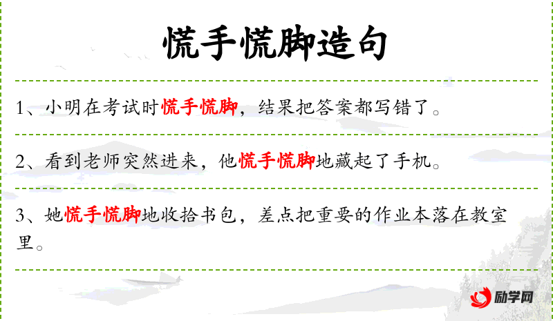 1. 【慌手慌脚】 形容动作忙乱的样子。
