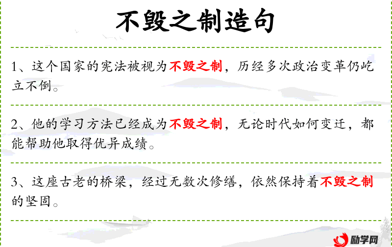 1. 【不毁之制】 毁:毁坏;制:制度。不楞破坏的制度。指经久不变的制度。