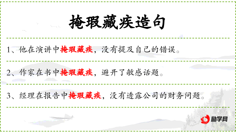 - 掩瑕藏疾:掩盖自己的缺点和错误。