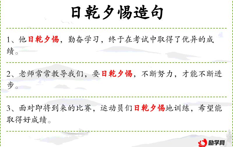 - 日乾夕惕:源自《周易·乾》,原文为“君子终日乾乾,夕惕若厉,无咎”,意为君子整天勤奋不懈,夜晚也警惕着,没有灾祸。