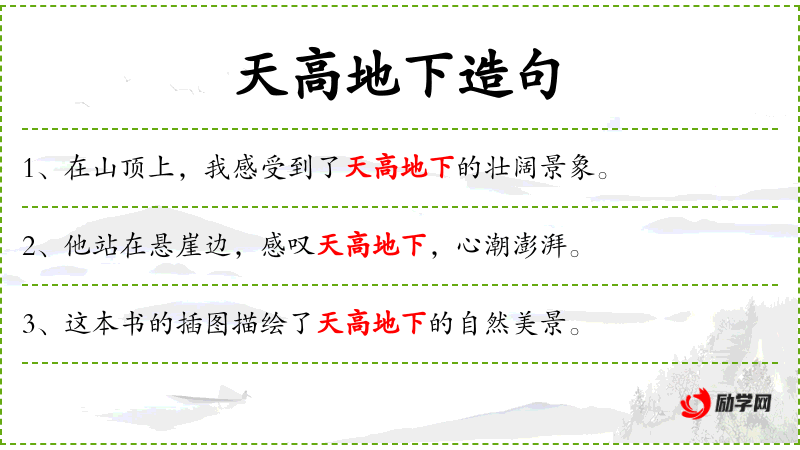 - 天高地下的自然美景:指天空和地面之间的自然景观,强调其美丽和壮观。