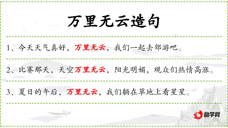 1. 【万里无云】 湛湛蓝天,没有一丝云彩。形容天气晴朗。