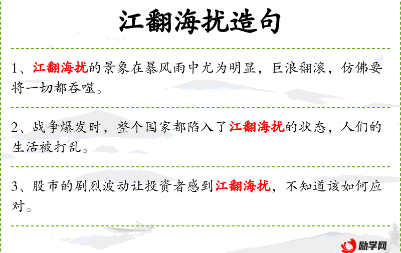 3. 【江翻海扰】 犹江翻海沸。形容水势浩大。多用以比喻力量或声势壮大。
