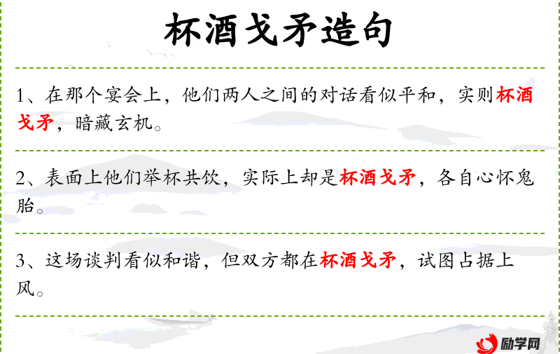 1. 【杯酒戈矛】 - 比喻在宴会上引起的仇恨。