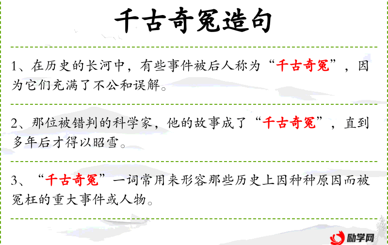 - 千古奇冤:指历史上极其冤屈的**,常用来形容非常不公正或冤屈的事情。