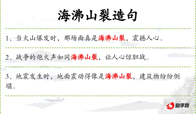 1. 【海沸山裂】 - 海水沸腾,山石崩裂。比喻声势或力量极大。亦作“海沸山摇”。