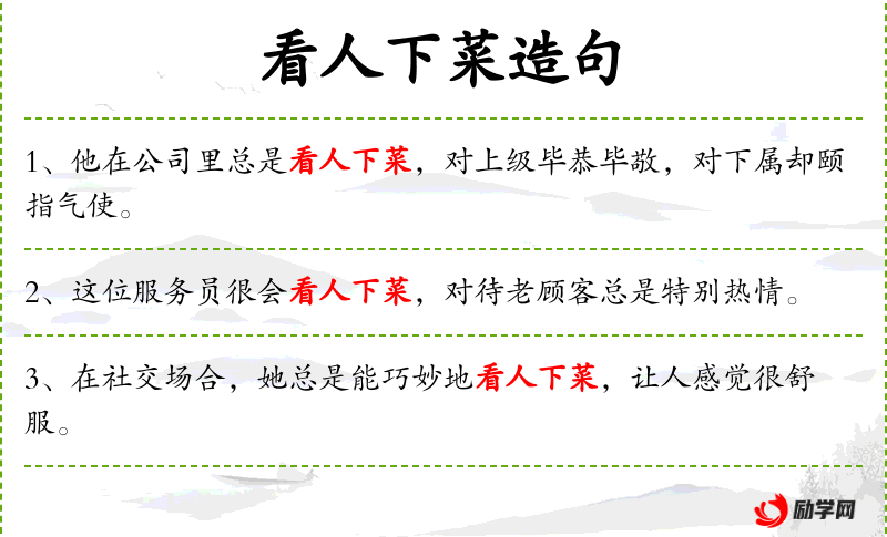 4. 【看人下菜】 比喻对不同的人用不同的方式对待。