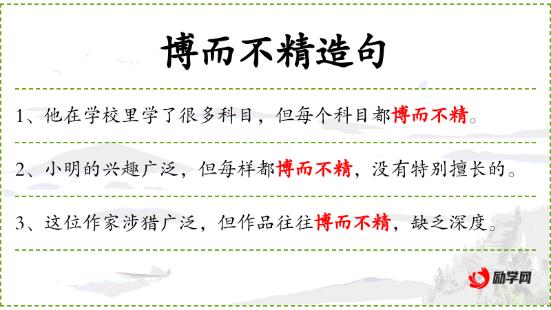 - 博而不精:指广泛涉猎但不深入。