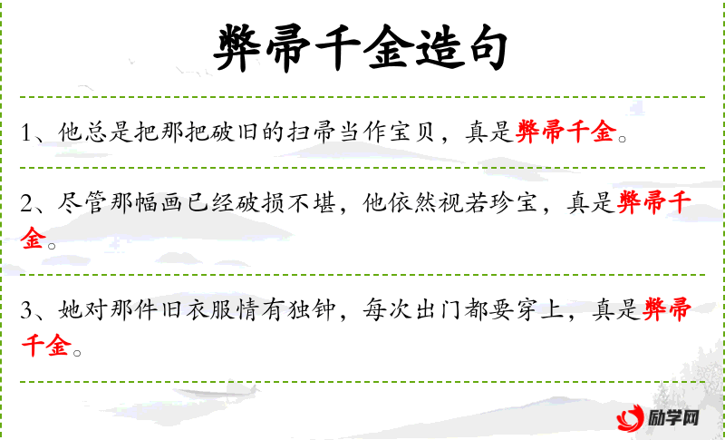 1. 【弊帚千金】 对自家的破旧扫帚,也看成价值千金。比喻对己物的珍视。弊,一本作“敝”。