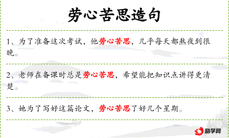 - 劳心苦思:形容非常用心地思考,同义词有“绞尽脑汁”、“苦思冥想”。
