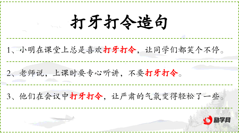 - 打牙打令:这个词组可能是方言或特定行业的术语,具体含义需要根据上下文或文化背景来确定。通常可能指的是轻松幽默的谈话或玩笑,以缓解工作压力。